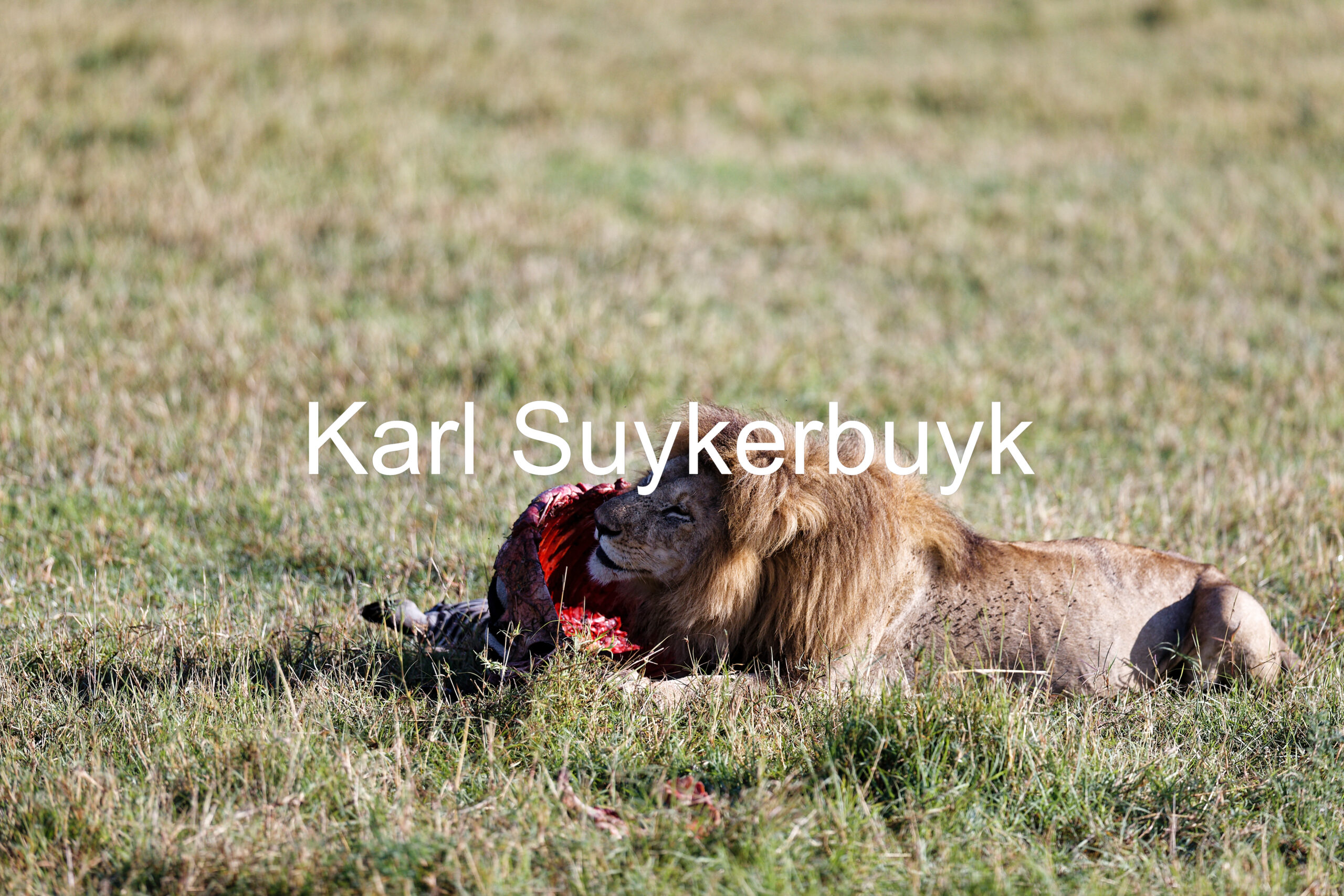 A picture of a male lion with a zebra kill being surrounded by a hyeana clan.