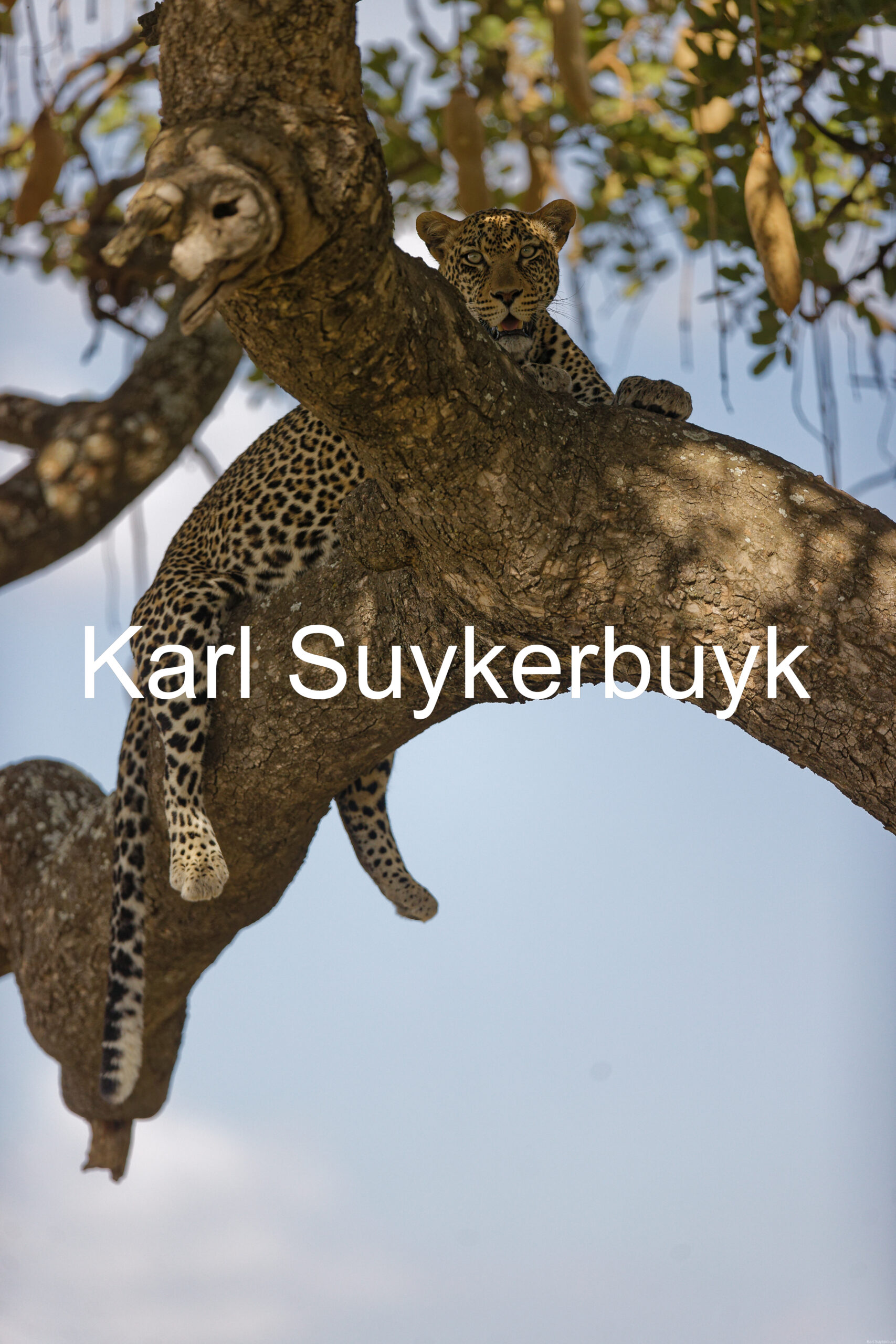 A picture of a Leopard in a Sausage tree.