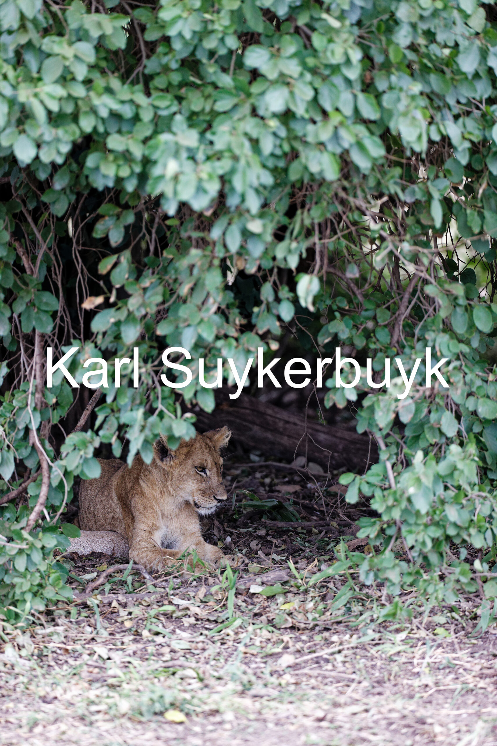 A picture of a lion cub hiding in the bushes.