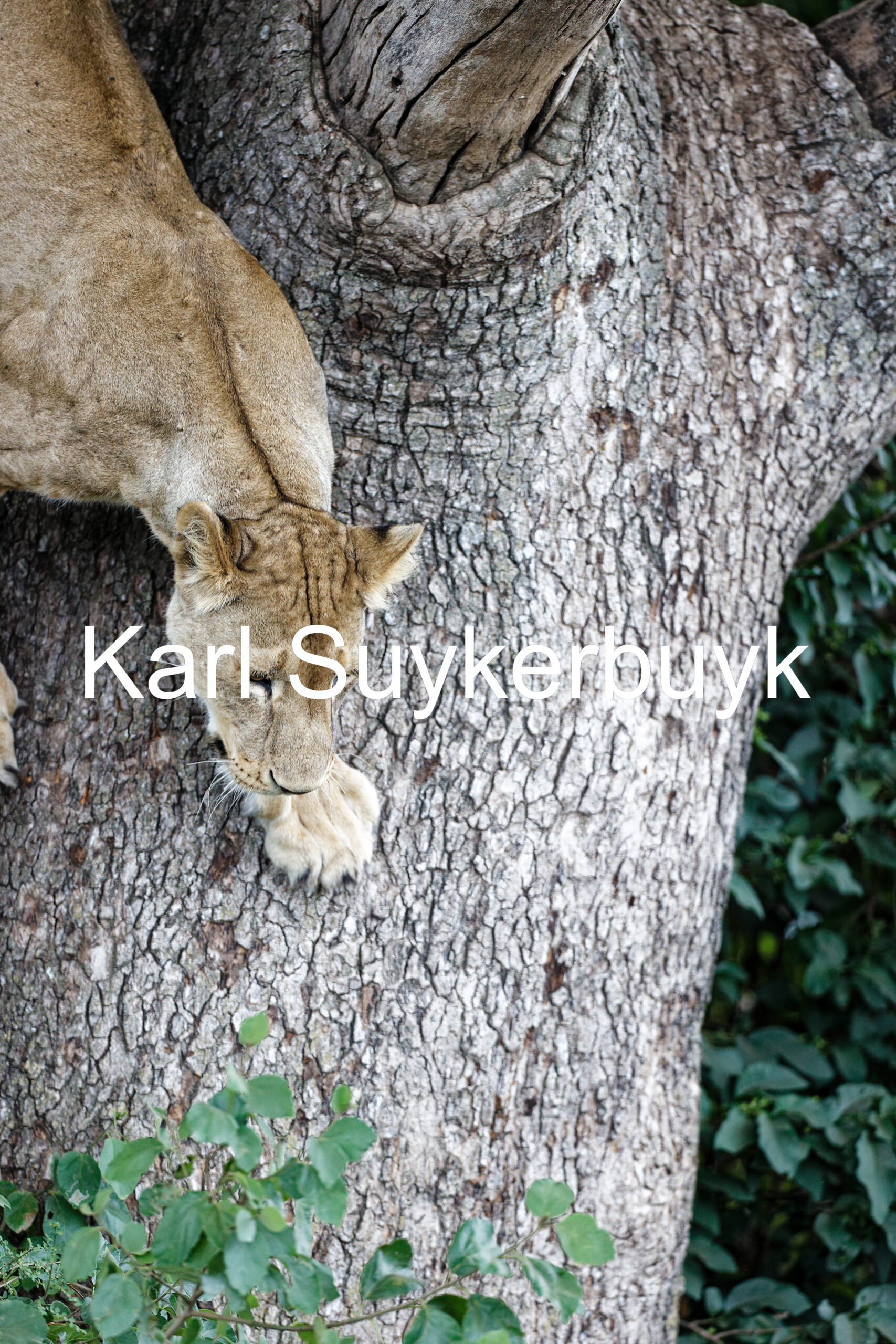 A picture of a lioness climbing out of a tree in the Serengeti.