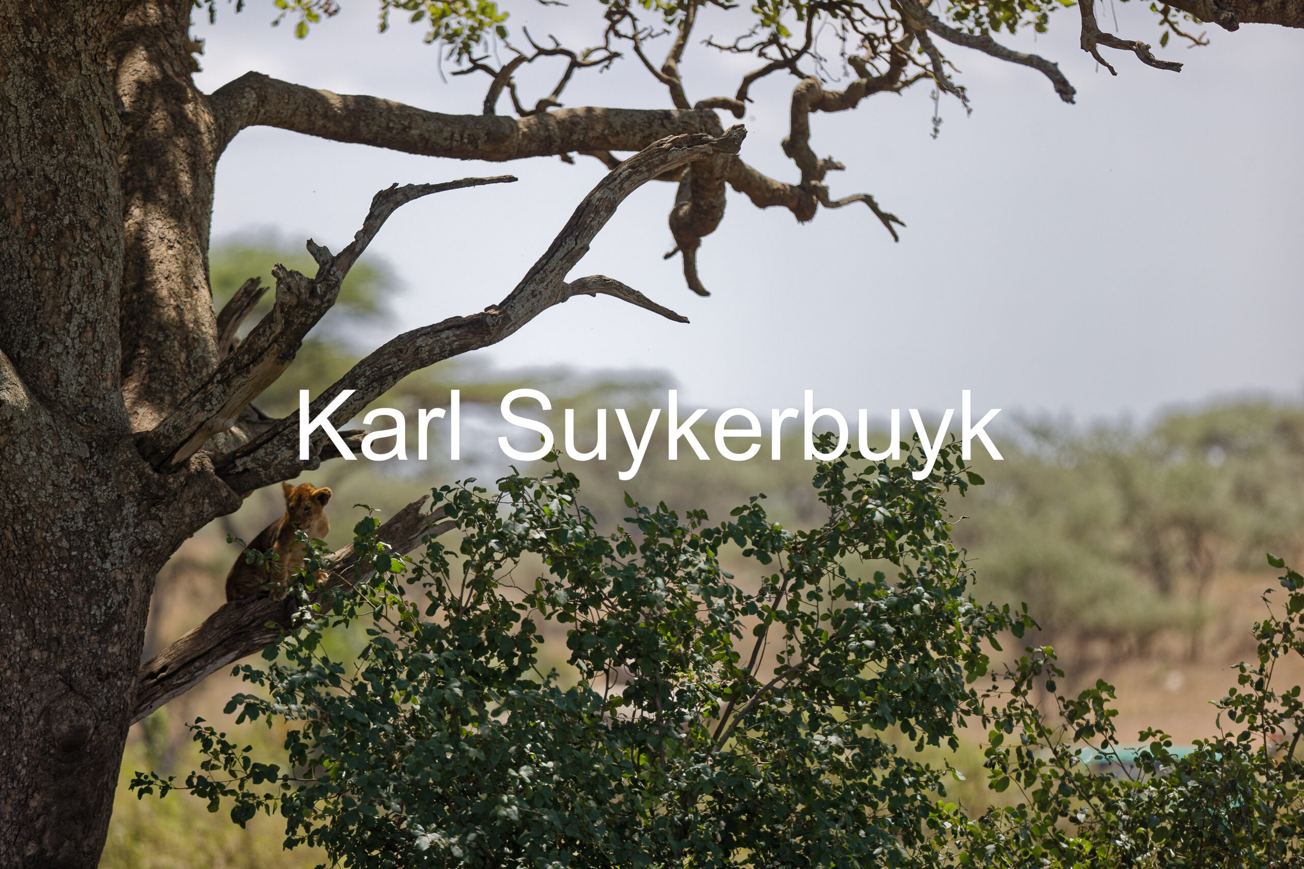 A picture of a lion cub in a tree in the Serengeti.