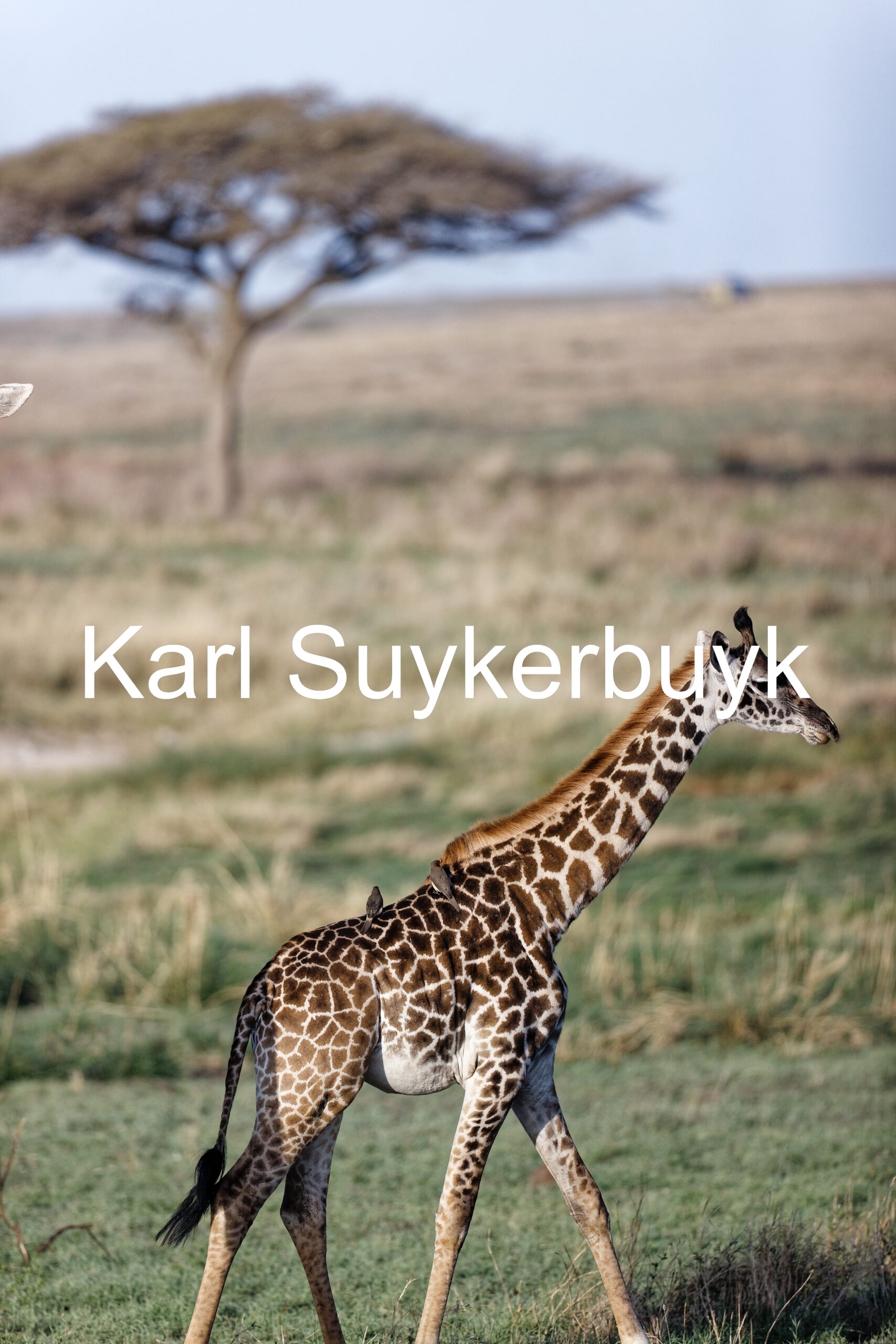 A picture of a young giraffe walking over the Serengeti.