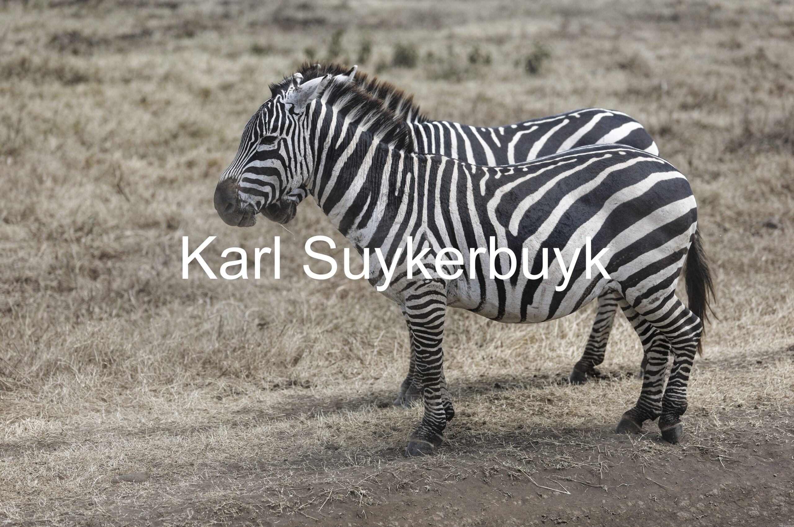 Two plains zebras stand closely together in the dry, golden grasslands of Tanzania. Their striking black and white striped coats contrast beautifully with the muted, natural tones of the surrounding savannah, capturing a quiet moment in the wild.