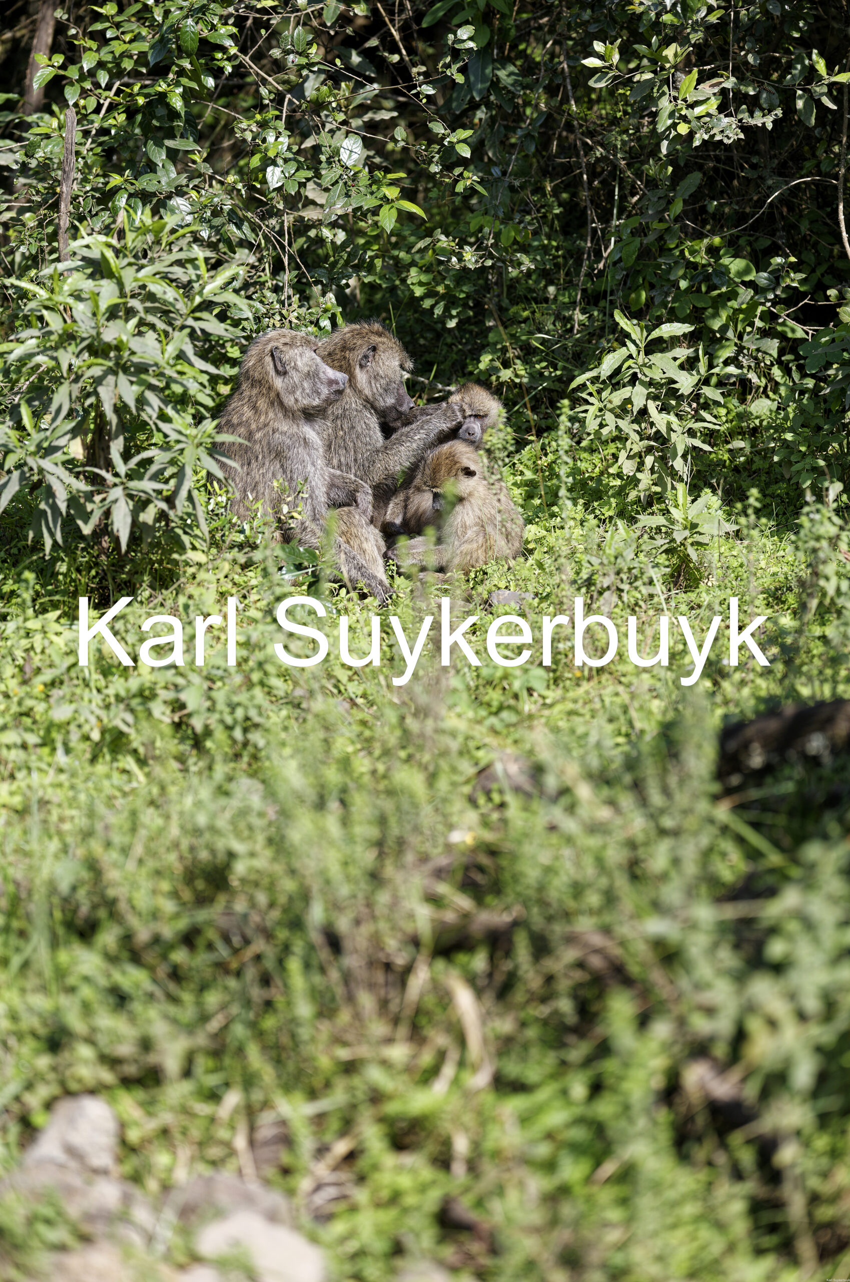 “Captured in the lush wilderness of Tanzania, this intimate image reveals the tender social dynamics of an Olive Baboon troop. Nestled among the vibrant green undergrowth, the family group engages in social grooming—a vital daily ritual that strengthens familial bonds and maintains harmony within the troop. The soft, natural light highlights the intricate textures of their fur and the focused, gentle expressions of the primates, offering a rare, serene glimpse into the everyday life and deep connections of African wildlife.”
