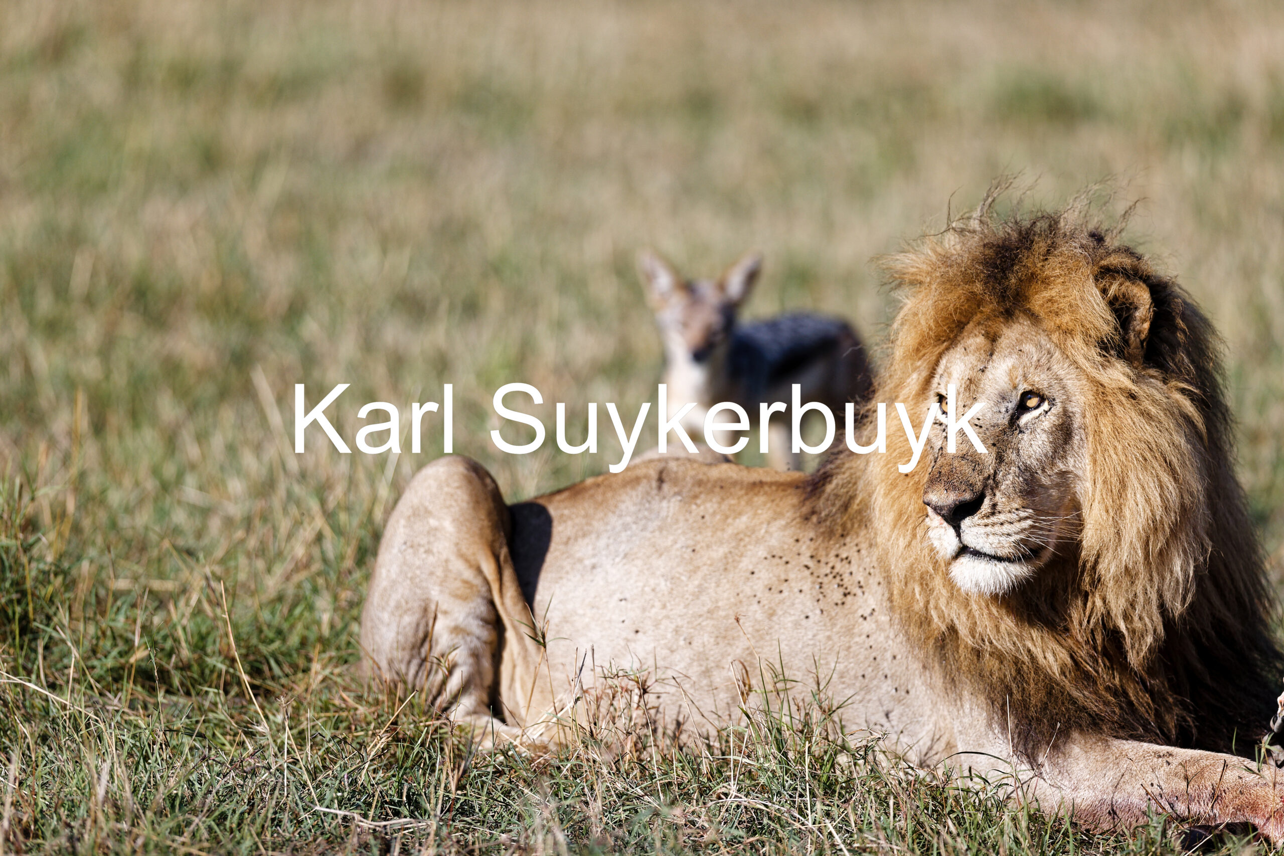 A picture of a male lion with a zebra kill being surrounded by a hyeana clan.
